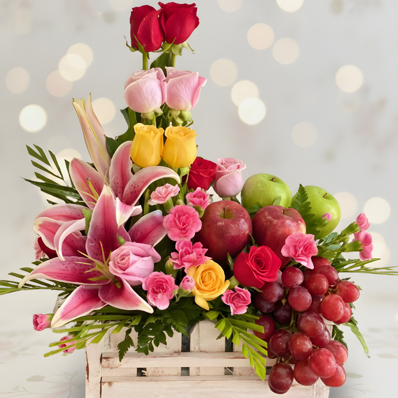 Este arreglo ha sido creado para cautivar los cinco sentidos: Una paleta de colores vibrantes unificado con la profundidad de nuestras frutas seleccionadas, crujientes y dulces complementando con el perfume embriagador de los lirios y rosas frescas que inundará cualquier lugar.
